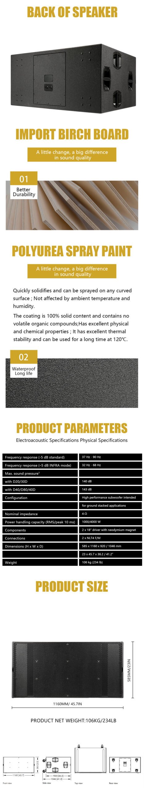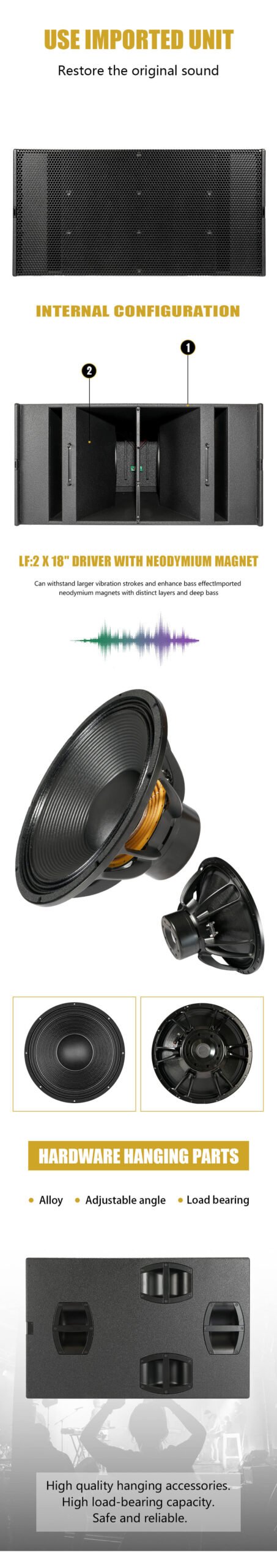 •    LF: 2 × 18″ front-facing woofers