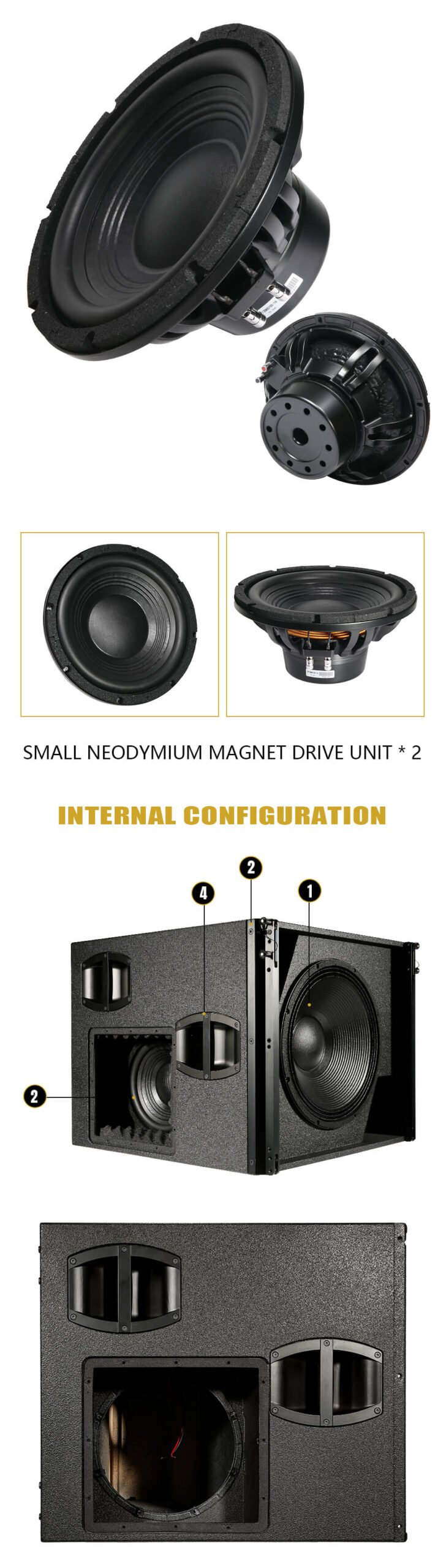 •    Configuration: Cardioid subwoofer, 18″ front + 12″ rear
