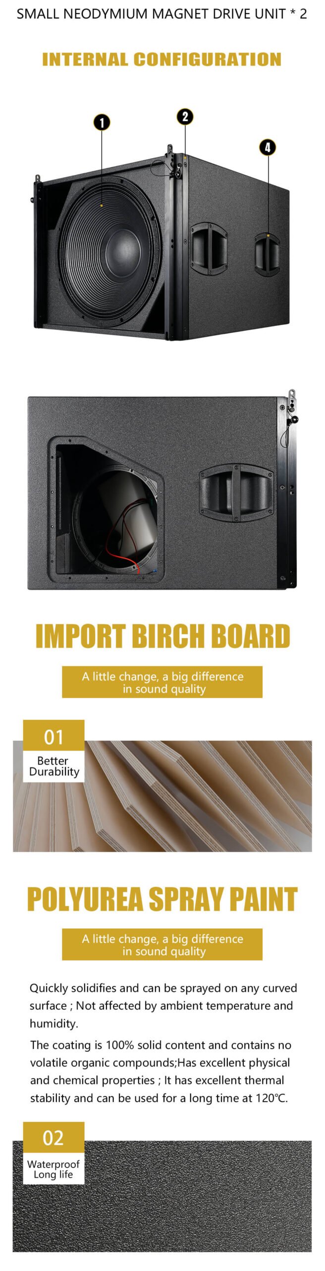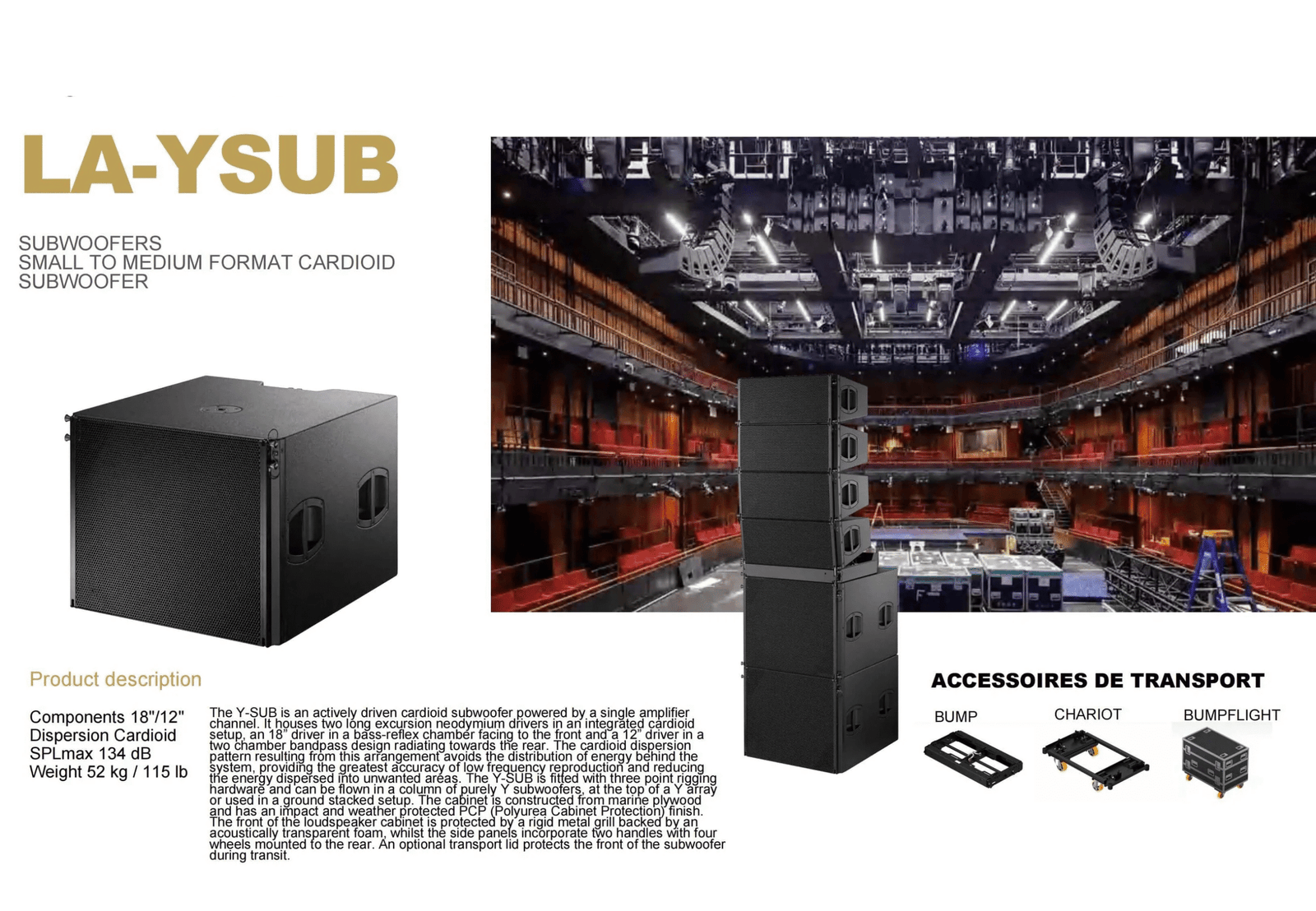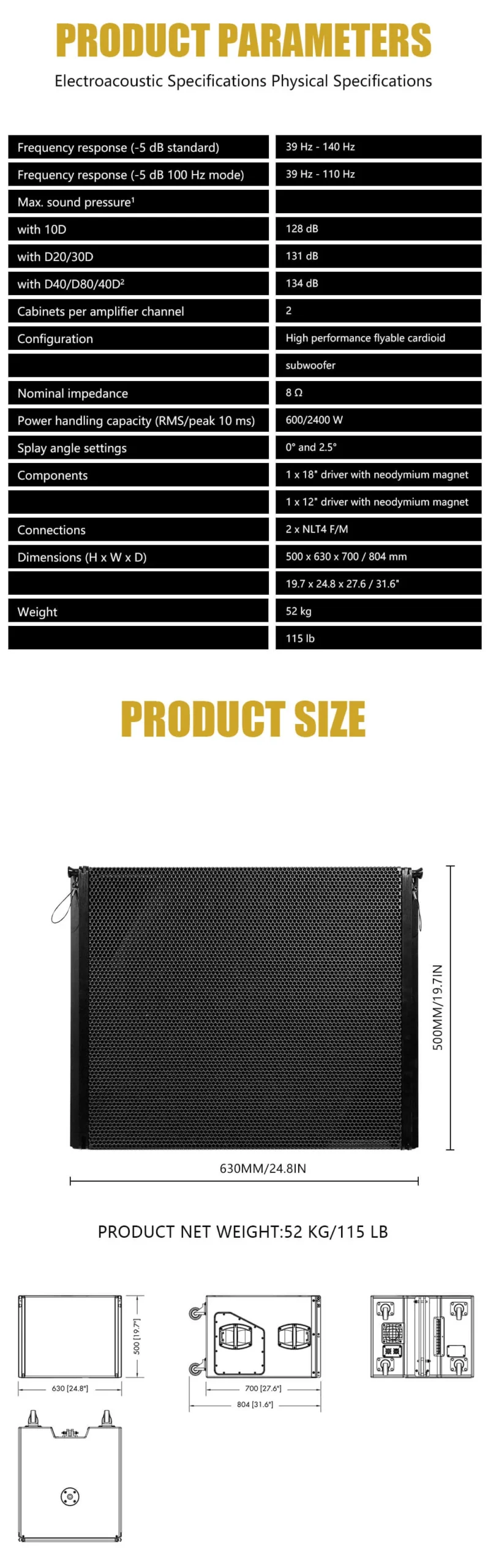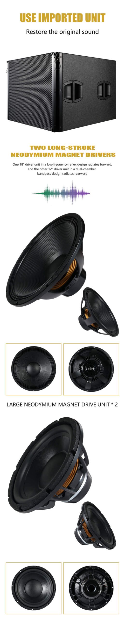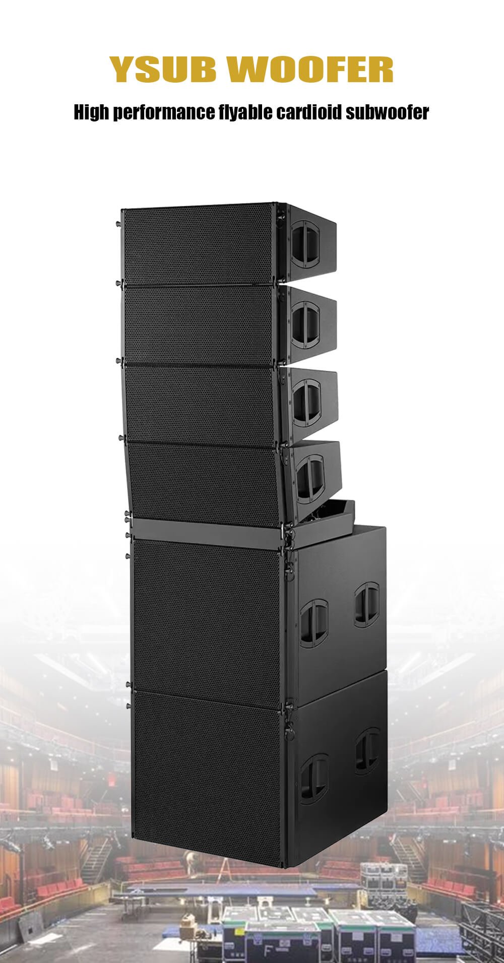 • Configuration: Compact cardioid subwoofer, 18″ front + 12″ rear